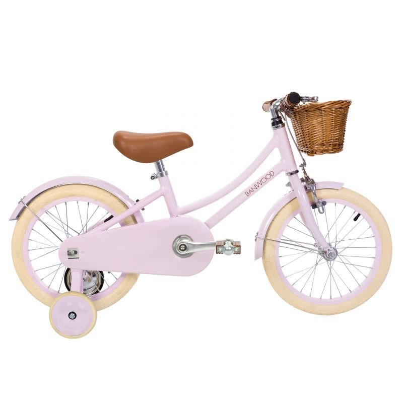 Vélo en métal Enfant 16" Rose Banwood, parfaitement vintage. Fournie avec son panier en osier pour ranger toutes les petites affaires les plus importantes à emmener en promenade : doudou, gouter, bouquet de fleurs et les cailloux ramassés.