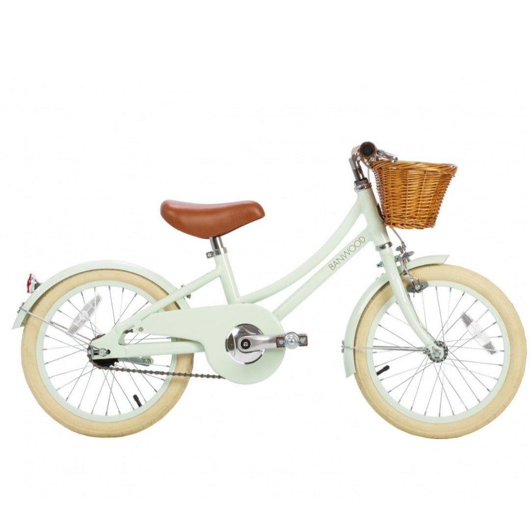 Vélo en métal Enfant 16" Vert Menthe Banwood, parfaitement vintage. Fournie avec son panier en osier pour ranger toutes les petites affaires les plus importantes à emmener en promenade : doudou, gouter, bouquet de fleurs et les cailloux ramassés.