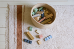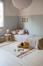 Inspired by traditionally woven kitchen linen with stripes and checks, this rug is made from our RugCycled mixed canvas base, with soft tufted cotton pile on top in undyed natural color and 3 caramel-colored bands, with short pile at the border. Finished with short fringes on the edge.