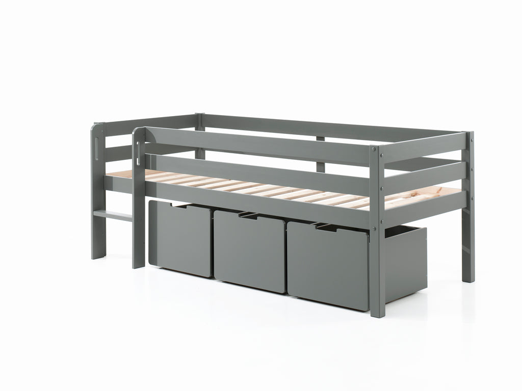 The lit mezzanine mid-height PINO by Vipack in lacquered gray finish is the ideal solution to furnish a child's room that is functional, safe, and aesthetic. Made of Scandinavian solid pine, this moderately elevated model (85 cm) is perfectly suited for young children from 4 years old.