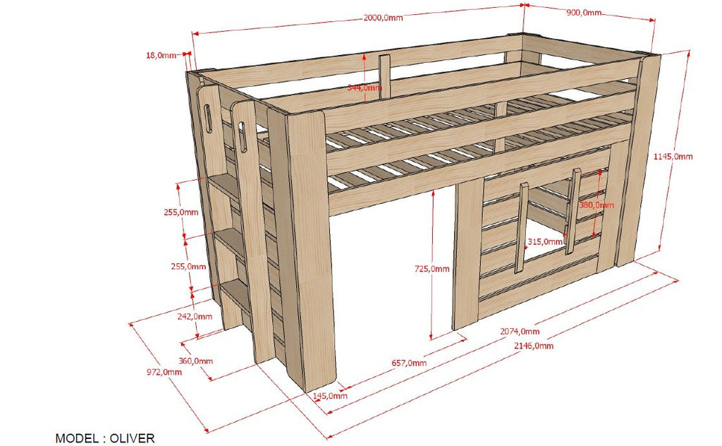 Le lit OLIVER est en pin massif et fini avec une laque couleur chêne naturel. Le sommier à lattes est inclus avec ce lit. Le lit a une bordure haute pour que votre enfant puisse dormir en toute sécurité. La partie inférieure du lit ressemble à une maison et garantit des heures de plaisir!