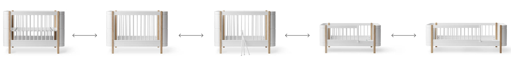 La beauté des lits Oliver Furniture est qu’ils sont conçus pour durer et grandir avec votre enfant et votre famille. Si vous choisissez par exemple un lit bébé Wood Mini +, celui-ci devient un lit junior puis éventuellement un lit mezzanine ou un lit superposé lorsque l'enfant grandit. Ces lits plus grands peuvent ensuite également être transformés en deux lits simples. Tant de possibilités !