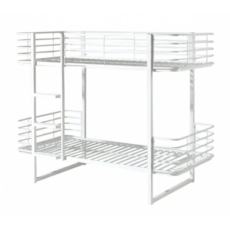 Le lit superposé blanc en métal de la collection OSCAR dispose d'un look et design industriel unique. Les côtés élévées du lit en haut et les marches extra larges permettent un usage extra sûr de ce lit superposé. Le lit doit être attaché au mur et offre une très grande stabilité.