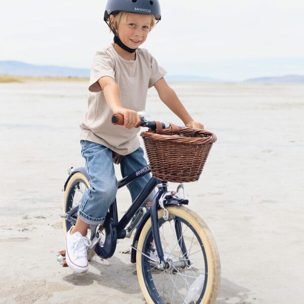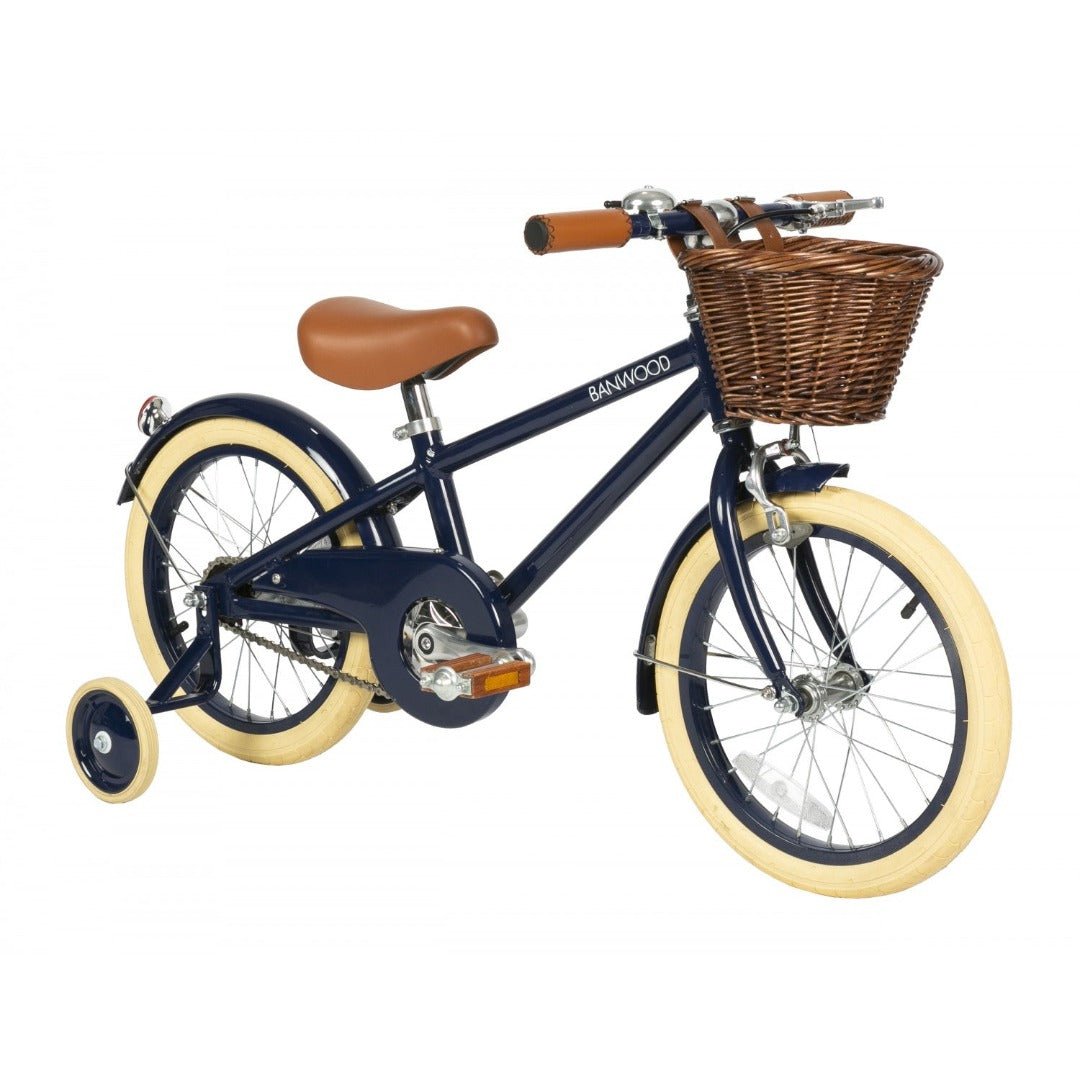 Vélo en métal Enfant 16" Bleu Marine Banwood, parfaitement vintage. Fournie avec son panier en osier pour ranger toutes les petites affaires les plus importantes à emmener en promenade : doudou, gouter, bouquet de fleurs et les cailloux ramassés.