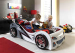 Esta cama de carro brap é fabricada em MDF lacado branco. A cama inclui um estrado de ripas e é adequada para um colchão de 90x200cm.